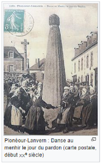 Dans un "pays" traditionnel où les danses se font en chaîne ouverte ou en cortège, la ronde fermée existe encore au début XXe siècle comme on peut le voir sur cette ancienne carte postale qui montre une ronde de jeunes filles de Plonéour-Lanvern autour du Lec'h cannelé du bourg, un monolithe de granite taillé comme celui de Sainte Tréphine (période allant de la Tène au Haut-Moyen-âge) et qui est sensé représenter le mât du bateau de Saint Enéour, patron de la paroisse. Ce rite circulaire se déroulait lors du pardon du premier dimanche de mai, disparu dans les années 1970 mais qui semble renaître depuis peu!